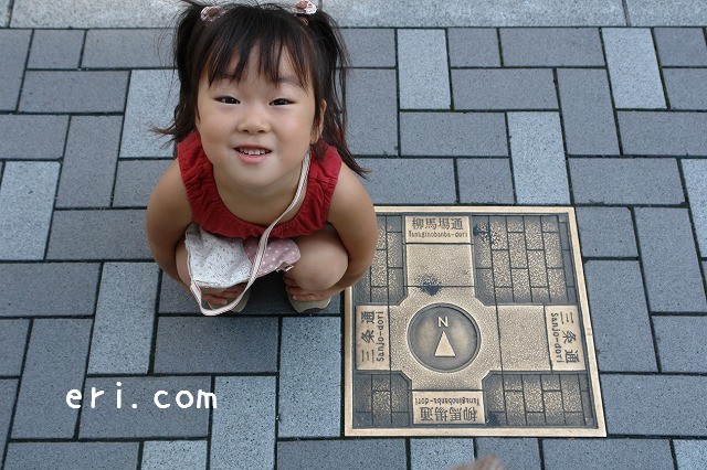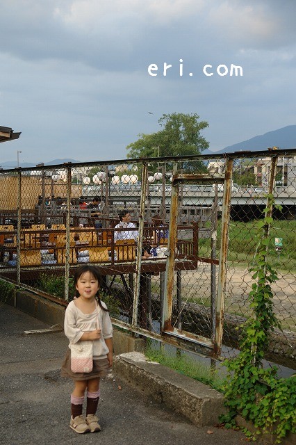 京都の夏川床料理を食べるスペースを背後に記念撮影