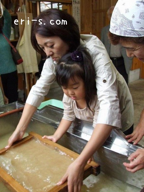 紙すき体験、娘は腕まくりをし張り切って参加(^∀^)